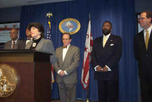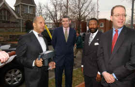 ![]() Mayor Williams; Scott Weiss, Brita Products Company, City Administrator Robert Bobb; and Glenn Gerstell, Chairman, WASA; March 3, 2004 (photo by Lateef Mangum, EOM) | ![]() City officials announce interagency task force on lead in water, February 11, 2004 |